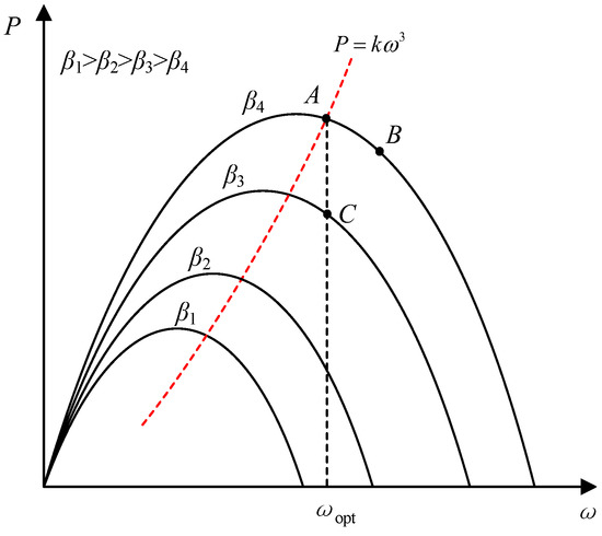 The wind power characteristic curves of different speed are shown in Figure 1, in which the curves represent the relationship between wind power output and rotor speed at fixed wind speeds. When the wind turbine is in normal operation, the operating point A is the MPPT point corresponding to the current wind speed, and the operating point B is the over-speed point, the operating speed deviates from the MPPT point to realize the load reduction operation of the unit; the sub-optimal power operating point C is the variable pitch control load reduction point, that is, on the basis of the MPPT operating point pitch angle increases from β4 to β3 while keeping the rotational speed unchanged, and the corresponding wind power utilization coefficient is reduced due to the increase of the pitch angle. As the pitch angle increases, the corresponding energy utilization coefficient declines, and thus output power also decreases.