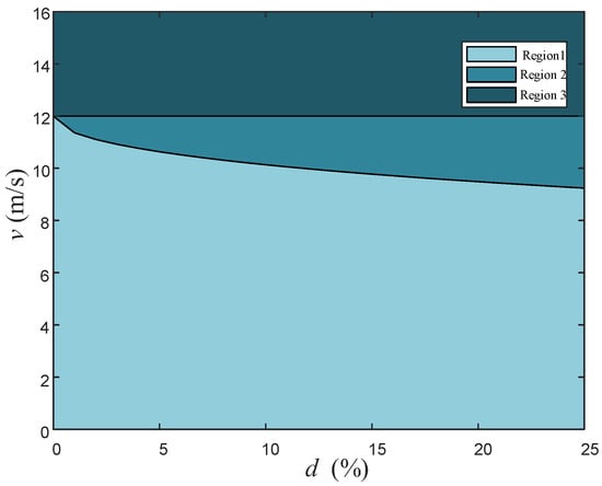 The above equation can calculate the unique critical wind speed under each reserved load reduction level and fit to get the relationship curve between reserved load reduction level and critical wind speed. When , the wind turbine adopts over-speed deloading control to obtain the reserved deloading level, and the region is defined as region 1; when , the wind turbine adopts over-speed deloading control as well as pitch angle control together to obtain the reserved deloading level, and the region is defined as region 2; when , the wind turbine uses pitch angle control to obtain the reserved deloading level, and the region is considered to be region 3, and the FR region is calculated once. The division is shown in Figure 3.