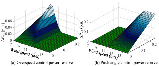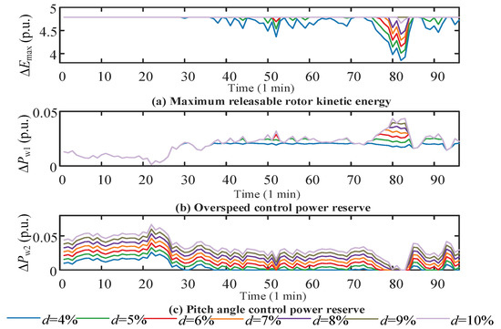 By setting different reserved deloading levels, the calculated maximum releasable rotor kinetic energy, over-speed control power reserve, and pitch angle control power reserve of wind power are demonstrated in Figure 9.