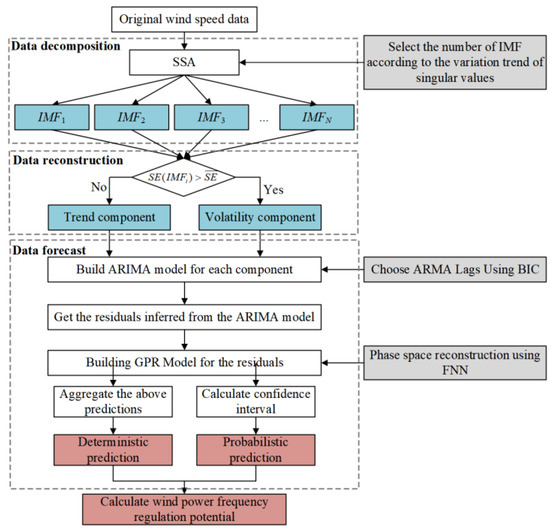 The analysis of the factors affecting the FR potential in Section 3.1 suggests that the wind power FR potential varies with the real-time wind speed, and the wind speed shows a chaotic, uncertain, and volatile sequence. To obtain the predicting accuracy of wind power FR potential, a hybrid prediction model framework dependent on SSA as well as GPR is proposed in this paper.