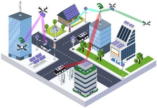 Owing to the high flexibility and low deployment cost, UAV-enabled communications provide promising solutions to a variety of problems [3,9]. For example, the world’s leading industrial companies, such as Facebook, Google, and Qualcomm, are investing in developing services that can provide high-speed Internet in the air through UAVs [2]. Furthermore, UAVs can be integrated with various technologies in wireless networks [10]. Recently, advanced technologies, such as non-orthogonal multiple access (NOMA), millimeter-wave (mmWave), and terahertz (THz), have been applied to UAV-enabled communications under various scenarios. The basic idea of the NOMA technique is to allocate non-orthogonal resources among the users at the cost of increased receiver complexity, which is required for separating the non-orthogonal signals [11,12,13]. We can support massive devices more over the UAV by the UAV-enabled communications scenarios adopting NOMA. More devices can be served by adopting NOMA in UAV-enabled communications systems [14]. Both the mmWave and THz bands provide a wide bandwidth to support a high data rate in UAV-enabled communications [15]. However, UAV systems typically have strict size, weight, and power constraints [6]. These constraints affect the flight time, durability, and communication performance. In particular, UAVs consume propulsion energy to support mobility, which is typically several times higher than the communication energy, in addition to transceiver power consumption. A UAV at high altitude typically forms LoS links to ground nodes; however, UAV–ground channels are occasionally blocked by trees and skyscrapers in urban areas, which may degrade the communication performance. Due to size and power limitations, UAVs have also faced limitations in adopting advanced technologies that can support high data rates and an ever-growing number of devices [9]. Those problems can be alleviated if wireless channels become more reliable and less power-consuming. This necessitates a new communication paradigm, that is controllable or reconfigurable wireless environments.