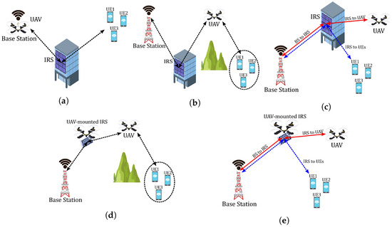 Figure 2 illustrates the five representative scenarios of IRS-assisted UAV communications. The scenarios are first classified according to the installation location of the IRS, and then, each class is divided into specific scenarios according to the role of the UAV. Scenarios (a)–(c) correspond to the case where IRSs are installed on the outer walls of buildings on the ground, whereas Scenarios (d)–(e) correspond to the case where IRSs are mounted on UAVs. In Scenario (a), UAVs function as aerial BSs, which will be effective when terrestrial BSs are not available (e.g., disaster areas, remote areas, and shadowed areas). The IRS installed on the wall of a building can establish a reflective LoS link between the aerial BS and users on the ground. The control of the reflection at the IRS can be carried out with a very low power consumption through phase adjustment of the signals incident to the IRS [56]. In Scenarios (b) and (d), UAVs act as moving relays for supporting communications between a BS and users (ground users or other UAVs). Both the UAV with the IRS and the UAV without the IRS can serve as a relay in these scenarios, and the IRS either attached to the wall of a building or mounted on a UAV can be used to facilitate the relaying functionality. In particular, relaying with the UAV-mounted IRS does not incur any additional noise, and thus, it is energy efficient. Furthermore, due to the nature of reflective surfaces, the connected LoS links that pass through one or more reflectors are allowed to share the same frequency band, thereby improving the spectral efficiency [48]. In Scenarios (c) and (e), UAVs without IRSs are users served by a BS, and IRSs support communications between the BS and users. The IRS either attached to the wall of a building or mounted on a UAV helps communications between the BS and users. The UAV equipped with the IRS will be used to enhance various communication performance, such as signal amplification and coverage extension. The network configurations required for various scenarios are different, and various studies are in progress to optimize the system for each scenario. Furthermore, multiple scenarios can be combined together according to various applications of IRS-assisted UAV communications.