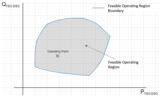 At the core of the DSO-managed models lies the Feasible Operating Region (FOR). The FOR (which is also called the capability chart of the ADN, the PQ flexibility area or map and the equivalent PQ capability) is used to represent the aggregated flexibility potential of a DN, by charting the feasible active and reactive power flows of the DN at the TSO–DSO interconnection. This approach to describe the flexibility potential of the DN was first introduced in [20]. In order to determine the FOR, the DSO must take into account the available flexibility of the assets that lie in the DN, the current status of the DN, as well as the physical constraints of the DN. The shape of a typical FOR can be seen in Figure 1.