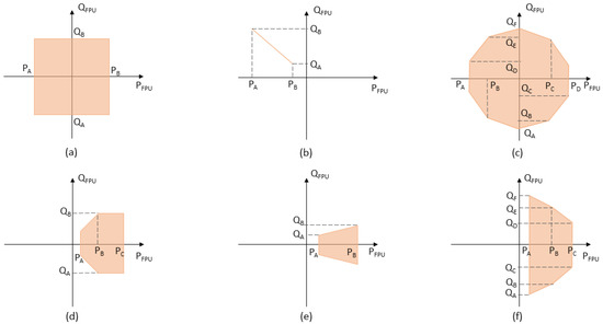 Capability charts of different types of FPUs: (a) generic FPU, (b) controllable load, (c) battery storage system, (d) wind generator, (e) photovoltaic generator, and (f) synchronous generator.