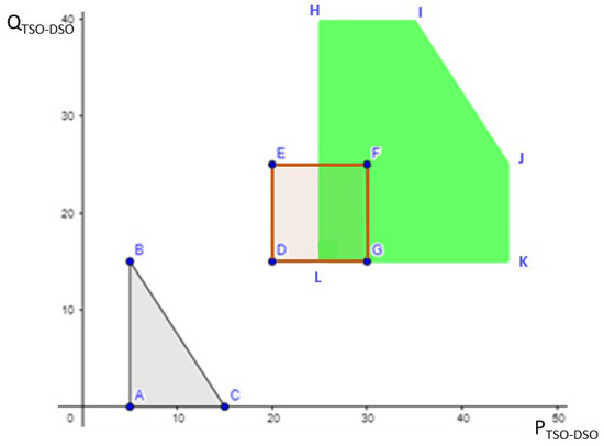 In mathematical terms, flexibility of an FPU can be described as the set containing all the power profiles an FPU can achieve, based on its current setpoint. Geometrically, this set is a polytope on the PQ plane [22]. In order to calculate the FOR, one has to aggregate the flexibilities of all the available FPUs, by combining them in a way that reflects the total available flexibility. To that end, Geometric methods use the Minkowski sum (M-sum, also known as the Minkowski addition, dilation, or point-wise sum). The M-sum is an operation between two sets that calculates their point-wise sum. Given two sets , their M-sum (which is denoted as ) is the set