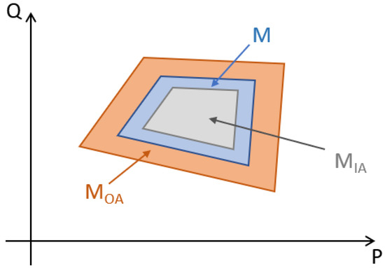 Assuming that is the set that contains the exact M-sum of two sets , the M-sum can be approximated either with an Inner Approximation (IA) or an Outer Approximation (OA). OAs overestimate the aggregated flexibility, meaning that if is the set containing the outer approximation of the M-sum, then . On the other hand, IAs underestimate the aggregated flexibility, meaning that if is the set containing the inner approximation of the M-sum, then . The differences between the M-sum, the IA of the M-sum and the OA of the M-sum can be seen in Figure 4. FORs calculated using OAs therefore overestimate the aggregated flexibility of the DN and can lead to points of the FOR that cannot be disaggregated amongst individual FPUs. Conversely, FORs calculated using IAs underestimate the aggregated flexibility of the DN, which leads to some flexibility being lost [22].