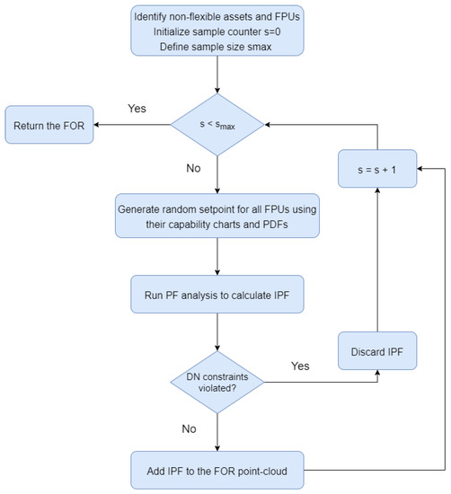 The results of the PF are ex-post-examined for violations of the constraints of the DN. In case violations exist, the IPF is discarded from the FOR point cloud. In the opposite case, the IPF is considered to be feasible, and thus is added to the FOR point cloud. The FOR is then defined by the contour of the FOR point cloud. This process is repeated until the maximum number of samples is reached. The process can be summarized in the flowchart shown in Figure 5.