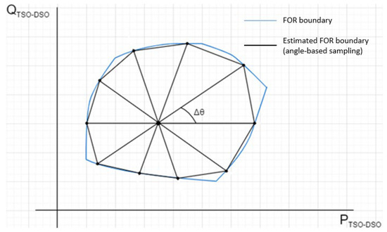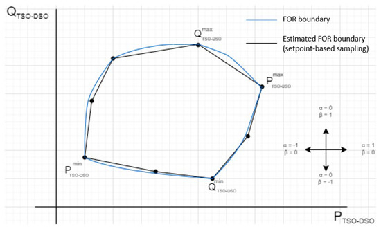 The results of the initial setpoint-based sampling can be seen in Figure 6. The contour of the true FOR can be seen in blue, while the contour that results by drawing the edges between the vertices obtained by the initial setpoint sampling can be seen in black. In some areas (e.g., between and ) the area of the FOR is overvalued, while in other areas (e.g., between and ) the area is undervalued. As discussed in Section 2, undervalued areas mean that some flexibility is lost, while overvalued areas can lead to infeasibilities in the dispatch.