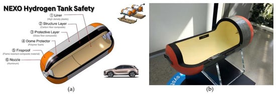 (a) Schematic cross-section of a hydrogen tank for Hyundai Nexo [18]; (b) photograph of a sectioned Hyundai Nexo hydrogen tank [19].