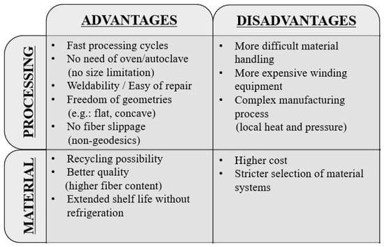 Advantages and disadvantages of tape filament winding with thermoplastics in comparison with wet filament winding with thermosets.