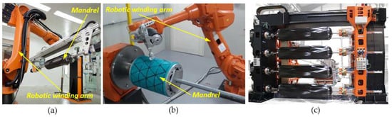 Arrangements of robot head installation: (a) fixed fiber guide/payout eye and flexible mandrel [119]; (b) flexible fiber guide/payout eye and fixed mandrel [118]; (c) Mikrosam’s automated production line for CNG and hydrogen tanks [120]. Reproduced with permission from Mikrosam.