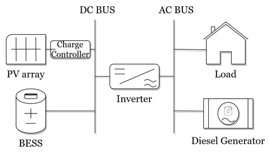The configuration of the MG to be optimized is shown in Figure 1. This is composed of a DC bus and an AC bus connected through an inverter. The PV array, load controller and BESS are connected to the DC bus, while the load and the diesel generator are connected to the AC bus. The main goal of the energy sources is to supply power to the load.