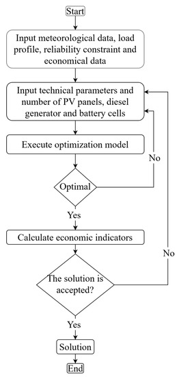 The sizing assessment methodology starts by reading the meteorological information, load profile, reliability constraints and economic information of the system. Once the previous step is defined, the technical information for each of the technologies considered in the analysis is incorporated in the model; for this, information must be available from the data sheet of each component of the system. After the initial information is configured, the evaluation methodology runs an optimization model that simulates an economic dispatch for one year with the objective of minimizing the cost of successfully meeting the load. If the constraints are not satisfied and it is not possible to meet the expected demand with the current energy resources, the methodology returns to the previous step to modify the initial parameters of the system. When an optimal solution is reached, the economic calculations and reliability of the system are computed. Finally, it is up to the decision-maker to accept the solution that was achieved by the proposed methodology or to evaluate other alternatives.