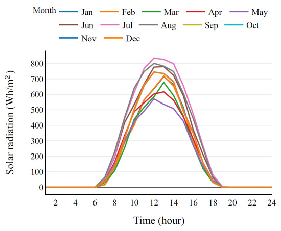 Figure 5 shows the daily average solar radiation for one year by month. The solar radiation is around 700 Wh/m, on average, daily, while the radiation is more than 770 Wh/m in June, July and August.