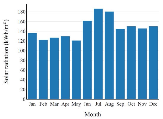 Figure 6 corresponds to the montly solar radiation for one year. As shown, the total summation of solar radiation by month is also the highest in in June, July and August.