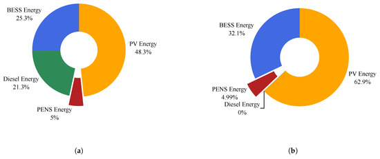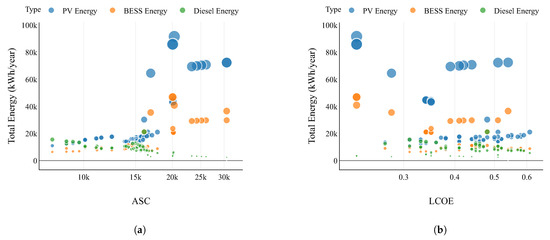 The total energy, by source, was related to ASC and LCOE. It was observed that the energy delivered by the PV array is higher with respect to other resources. In fact, the selected solutions provide 19 and 21 hours, respectively, without having energy that is not served to the load.