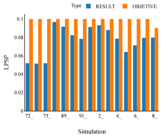 The loss of power supply probability () is given by Equation (27). This parameter is used to estimate the reliability of the MG, which is the ratio between the total energy not supplied to the load () and the total energy required by the load ().