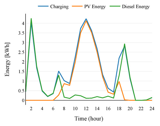 | Energy supplied to BESS from PV array and diesel generator in kWh | |