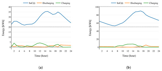 In this case, is the maximum SoC of the BESS considering the maximum capacity defined by Equation (8); on the other hand, is the minimum SoC of the BESS according to the maximum depth of discharge, defined by Equation (9), where is the maximum depth of discharge that determines the fraction of power that can be withdrawn from the BESS expressed as a percentage of maximum capacity.