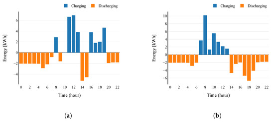 Charging and discharging process of the BESS over a day. (a) PV-BESS-DG configuration; (b) PV-BESS configuration.