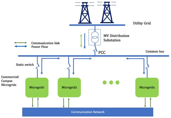 Figure 1 provides a schematic representation of multiple MGs that can exchange energy with each other in an arbitrary manner. Although the microgrids in this diagram are disconnected from the utility grid, we should point out that the connection can be reestablished whenever that becomes necessary. The MGs are concentrated in a relatively small geographic area and are connected to a common bus through a static switch. In configurations of this sort (which are known as clustered MGs), it is assumed that each subsystem can share its energy needs via a communication network. This assumption is realistic in a smart grid since smart meters are capable of broadcasting data over a network.