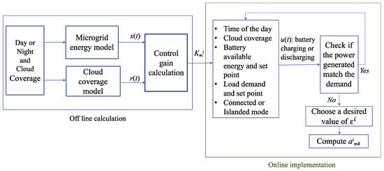 with , where and are and matrices, respectively, and denotes the current system mode (which is determined by a finite state Markov jump process). To simplify the notation, in the following we will refer to matrices as and as when the system operates in the ith mode []. Since reflects the cloud coverage during the day, this variable evolves according to a continuous time Markov chain. When designing an optimal controller for such a system, one aims to minimize the quadratic cost function: