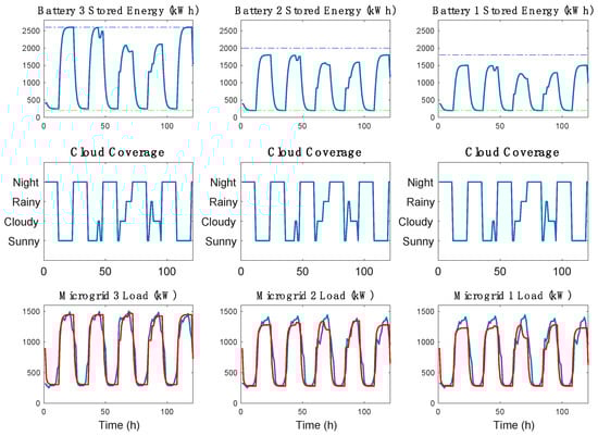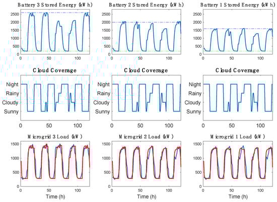 Simulation results when MGs 1–3 are interconnected: battery energy variation (top figure), cloud coverage (middle figure), commercial load (blue) and load power usage (red) (bottom figure).