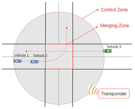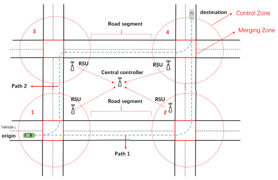 In this paper, we take a typical road network with four signal-free intersections as an illustration to explain our method, which is shown in Figure 1. We divide the area around the isolated intersection into the following two sections: the Control Zone (CZ) and the Merging Zone (MZ). The Control Zone is the circular area around the intersection where we can control the movement of the vehicles to avoid collisions. The Merging Zone is where the vehicles congregate. A roadside unit (RSU) is assigned as the local controller to schedule the CAVs within the intersection and exchange information with the central controller for each isolated intersection. Let represent the set of intersections index, . There are multiple feasible paths for the CAVs in the MiRN, from their origins to their destinations. The coordination strategy aims to find the optimal path with minimum travel time and to let the CAVs pass each isolated intersection without collision.