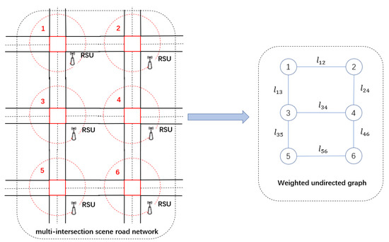 The MiRN can be described as a weighted, undirected graph, as shown in Figure 2. The weight in the undirected graph represents the path length between intersections and . For vehicle , we use and to represent its origin and destination in the road network and to denote the feasible path set from to , i.e., , where is one of the possible paths.