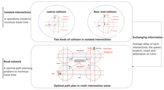 To minimize the time of the vehicles passing through the MiRN, we must address two key issues. First, we choose the optimal paths for the CAVs with their corresponding origins and destinations. Different paths cost the CAVs different travel times and affect the traffic of the intersections in reverse. Second, we need to make the CAVs travel safely to avoid lateral and rear-end collisions.