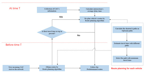 After the information exchange is conducted in cycle T, the central controller will choose a subset of CAVs to reroute their paths. The selection is based on the estimated travel time of each CAV; the longer the travel time, the greater the chance of being selected. Figure 5 shows the whole process.