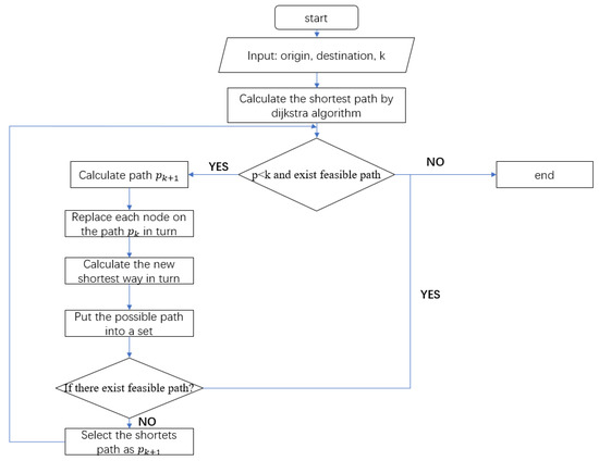 The k-shortest paths problem in an undirected graph is a classical one in graph theory; it was first proposed by Hoffman and Pavley in 1959 [44] and was solved by Yen in 1971 [45]. We adopt Yen’s algorithm to find the k-shortest paths in the MiRN as optimal paths. Let stand for the candidate paths set and represent the k-shortest paths. Let denote the n-th node on the m-th shortest path . The process of finding the shortest k paths is shown in Figure 6.