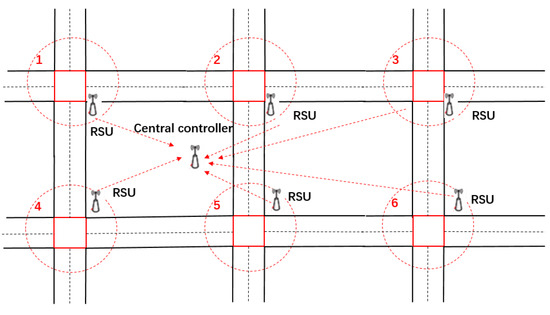 Illustration of exchanging information between RSUs and the central controller at an isolated intersection. Numbers 1–4 represent the intersection number.