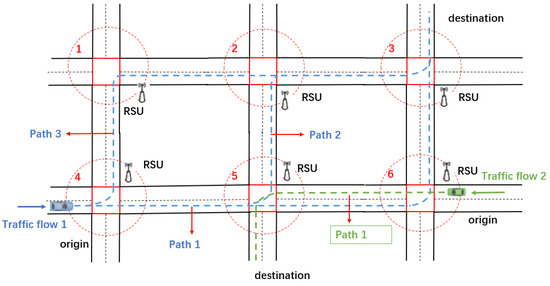 For simplicity and clarity, the simulation is carried out in a typical MiRN with six intersections, as shown in Figure 7. Two typical traffic flows are designed with a potential collision risk to verify the effectiveness of the path optimization algorithm proposed. We also compare our proposed method with the fixed signal time assignment method (STA) and the actuated STA [46] under the same settings, i.e., the road network and the traffic, as our proposed method. We reproduce the above two methods in the traffic simulation software SUMO v0.19.0 from Germany. Furthermore, the influence of varying parameters is also evaluated with different traffic, from sparse to crowded.