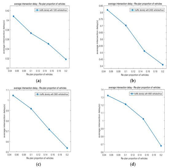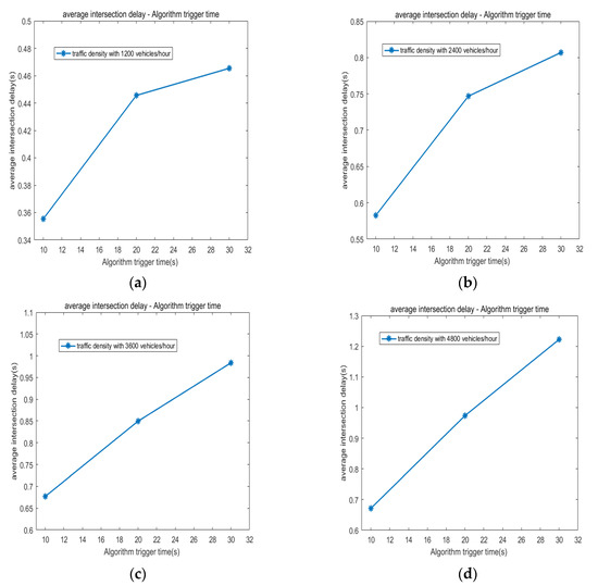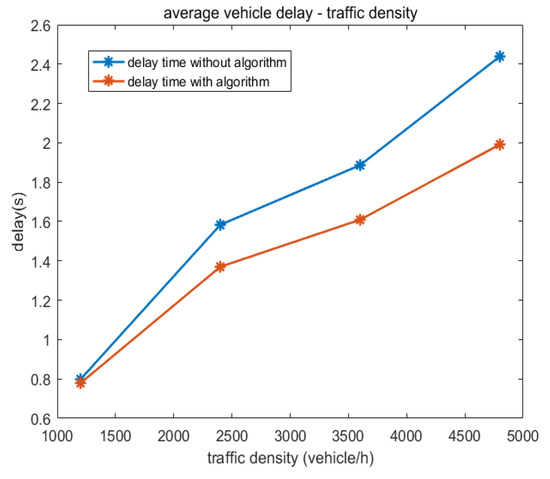 With and , Figure 12 shows that the smaller the cycle time T is, the lower the average delay time of the intersection is. The average delay time of the intersection with T set to be 10 s is reduced by 20–40% compared with the setting of .