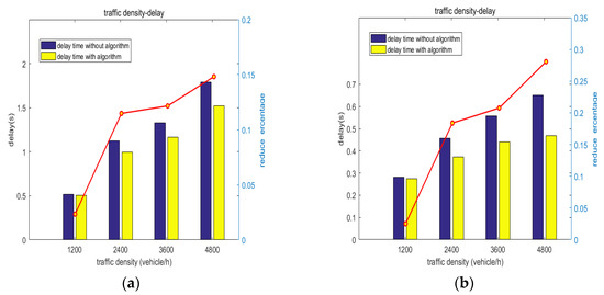 Comparison of delay with coordination strategy and without coordination strategy in different traffic densities: (a) intersection 5 and (b) intersection 6.