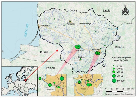 The study area was the urban water network with potential micro-hydro sites deployed in Lithuania. More than 20 potential sites for installing hydropower turbines were identified (Figure 1 and Figure 2). Most of them were located in the sewage network, while only one site was spotted in the drinking water distribution network with a pressure-reducing valve [48]. Their preliminary power capacity was estimated as less than 100 kW. These potential sites with preliminary key characteristics, including those operating in other countries, are freely available [9].