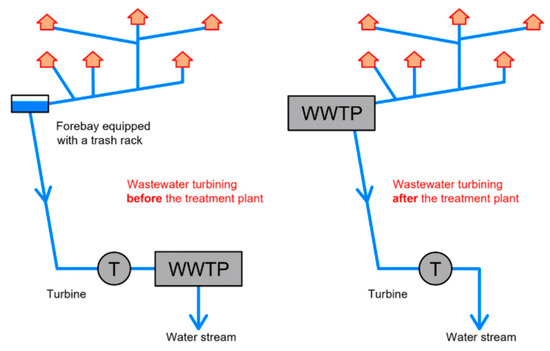 There are two layouts for installing a hydro turbine in sewage networks: upstream and downstream of the operating WWTP (Figure 3).