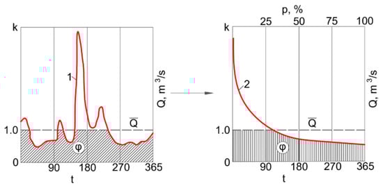 Hypothetical hydrograph (1) and flow duration curve (FDC) (2). Q—flow, m3/s; k—normalized flow; t—time, days; p—percentage time, %; —mean flow, m3/s; Φ—parameter.