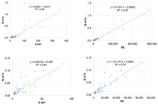 Relationship of mean annual wastewater flow with population equivalent (PE) and collection network service area (A, km2). Top—all 58 WWTPs; bottom—small WWTPs (large cities not included).