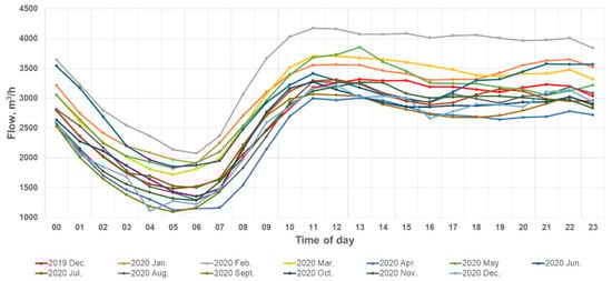 Treated water daily fluctuations for different months at the outfall of the Kaunas WWTP (December 2019–December 2020).