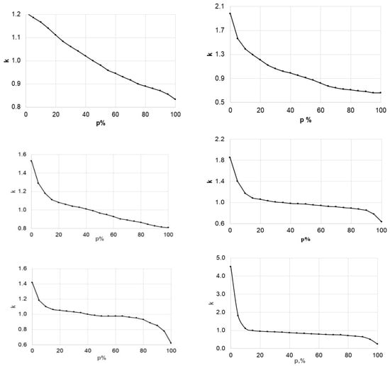 Normalized (dimensionless) FDCs for potential sites were constructed (Figure 8). Each 5% interval on the curve is equivalent to five percent of 8760 h (number of hours per year). Despite being in a dimensionless form (normalized to the mean annual flow), they varied widely. The parameter Φ was used to compare them, as shown in Table 3.