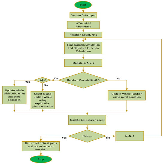 Metaheuristic optimization techniques in power systems require an appropriate cost function. As a rule, the goal of a cost function is to optimize a set of variables. Several metaheuristic approaches have been proposed in the literature, including particle swarm optimization (PSO), differential evolution (DE), and harmony search (HS). PSO is a metaheuristic optimization method that was initially motivated by the social behavior of flocking birds, whereas DE is motivated by Charles Darwin’s notion of natural evolution [47]. This study uses the whale optimization algorithm (WOA) to optimize the fractional order controller parameters. The WOA offers outstanding optimization performances compared to other algorithms, as described below [48,49]: