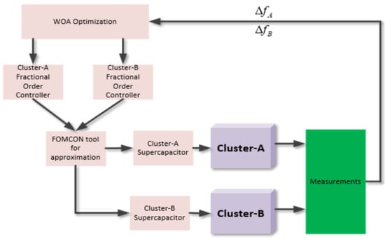 It is worth mentioning that most of the proposed approaches utilize a conventional proportional-integral-derivative (PID) controller, which has fewer degrees of freedom. On the other hand, a fractional-order controller can provide more degrees of freedom due to the option to choose any order with fractional numbers [32,33]. By incorporating additional real parameters, fractional-order controllers outperform conventional PI controllers in terms of system performance [34]. However, parameter tuning for a factional order controller is difficult compared to a conventional controller. The artificial bee colony (ABC) [35] technique has been presented to tune fractional-order controller parameters, which is complex in objective function evaluation and slow to convergence. From this critical discussion, it can be concluded that there is a research gap in the frequency control of microgrid clusters with fractional order supercapacitor approaches. To bridge this research gap, this study develops efficient supercapacitor control techniques for microgrid clusters. The advantages of the proposed controller include more degrees of freedom, quick power balance, improvements in overshoot, undershoot, and setting time, less frequency deviation, and robustness against uncertainties. A complete mathematical model for the microgrid clusters is developed to facilitate parameter tuning with an optimization approach. Several case studies are considered, including small and large load disturbances, repeated load changes, and uncertain renewable energy generation. The proposed controller is compared with conventional approaches, demonstrating better performance with the proposed approach.