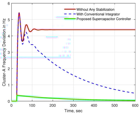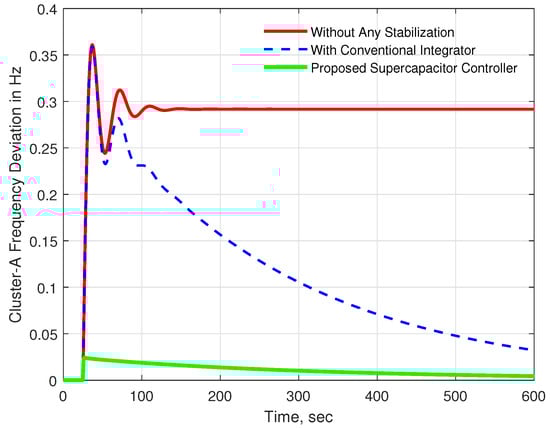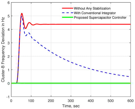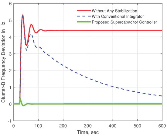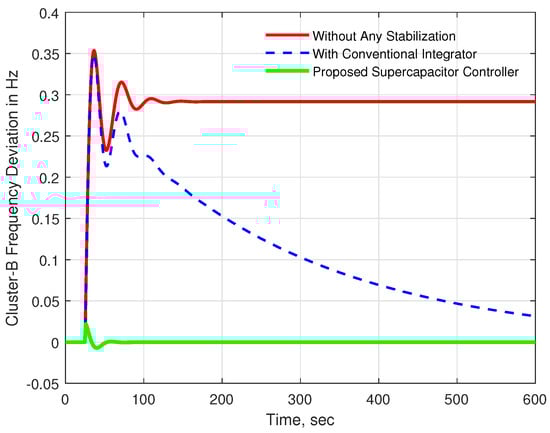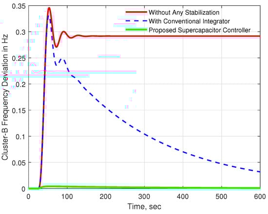 Small load disturbances in Cluster B were used to test the superiority of the suggested approach in frequency stabilization. During the time-domain simulation, a step load disturbance of 0.01 p.u. was tested in cluster B at 25 s. In this circumstance the microgrid cluster became unstable without any additional controller support, as demonstrated in Figure 11. While the traditional integrator controller increased the system’s dynamic performance by stabilizing the frequency response, it had a large frequency excursion. The proposed supercapacitor control technique, on the other hand, considerably minimized the frequency excursion. More importantly, it demonstrated very stable operation during the time domain simulation investigation.