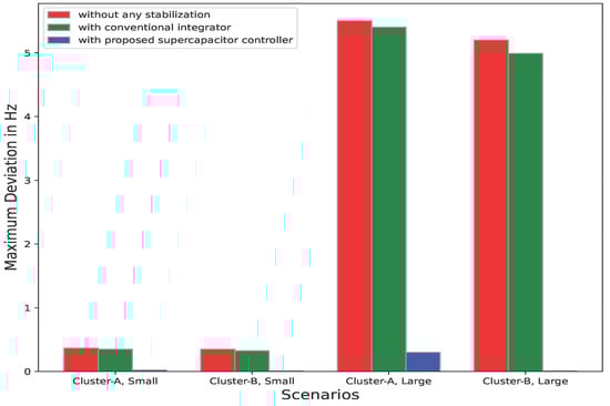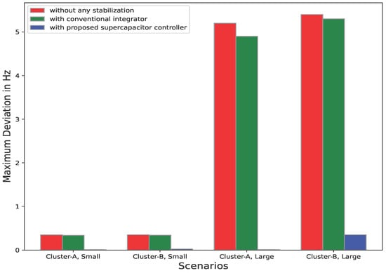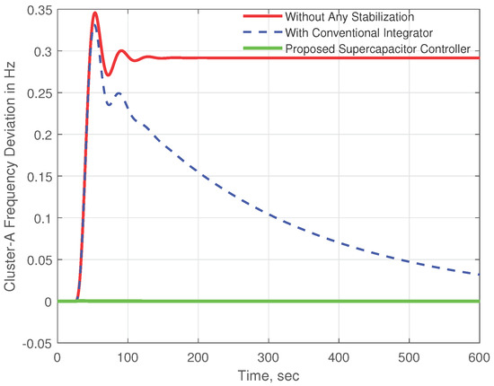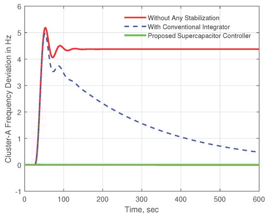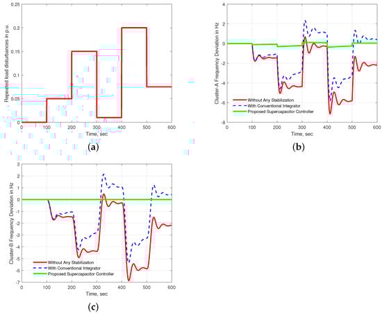In general, renewable energy sources integrated as a form of distributed generator are highly variable in nature due to the natural variations of sunlight and wind speed. In order to emulate the actual scenario, varying renewable energy was simulated in cluster B; the results are shown in Figure 18a. As can be seen, the injection of fluctuating power in cluster B causes frequency variation over the entire simulation time. In addition, the microgrid cluster is unstable in terms of frequency deviation both without any stabilization and with conventional integrator approaches. However, the system is stable and frequency variation is negligible for both cluster A and cluster B when the proposed supercapacitor control approach is used, as shown in Figure 18b,c.