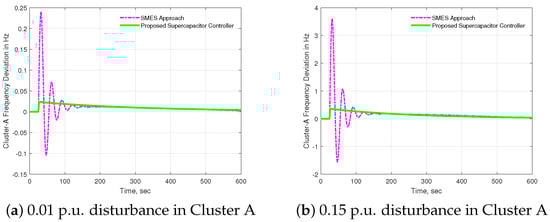 The superiority of the proposed fractional order supercapacitor was compared with recent approaches published in the technical literature. In recent years, superconducting energy storage systems have been applied in power networks to support virtual inertia. For example, superconducting magnetic energy storage (SMES) devices have been applied in low-inertia systems to stabilize system frequency during disturbances [54,55]. A virtual inertia support system with SMES as presented in [55] was compared with the fractional-order supercapacitor approach developed here. The supercapacitor approach was found to be more effective in damming frequency oscillation in the microgrid clusters. As shown in Figure 13a, for a small disturbance (0.01 p.u. load change) in cluster A, the fractional order supercapacitor shows better performance compared to the SMES approach. Similarly, for a large load disturbance of 0.15 p.u. in cluster A, the frequency oscillation is well damped with the proposed approach as compared to the existing approach (Figure 13b).