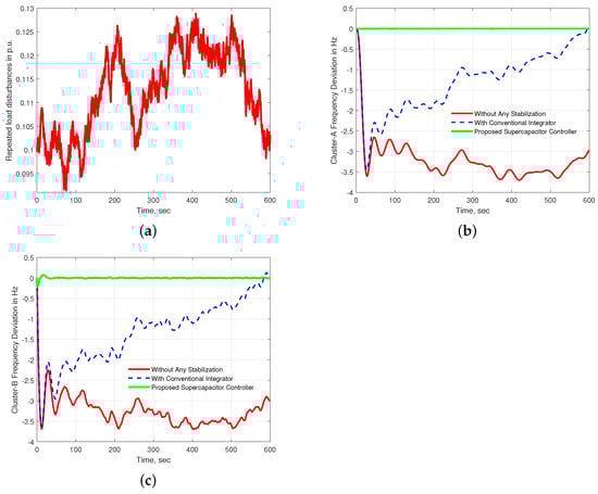Repeated load change scenarios were used to verify the effectiveness of the proposed supercapacitor control technique for the microgrid cluster. The repeated load change scenarios are plotted in Figure 17a. The load changes are 0.05 p.u., 0.15 p.u., 0.01 p.u., 0.2 p.u., and 0.075 p.u. at 100 s, 200 s, 300 s, 400 s, and 500 s, respectively. As shown, the microgrid cluster frequency response is very poor within the entire simulation period without any stabilization method. The conventional integrator approach slightly improves the frequency excursion. However, both approaches fail to return the frequency deviation to zero before the next disturbance. The proposed approach, on the other hand, is capable of reducing the frequency excursion in both clusters as well as stabilizing the system. Moreover, the proposed method performs substantially better in terms of overshoot, undershoot, and settling time in this scenario, as depicted in Figure 17b,c.