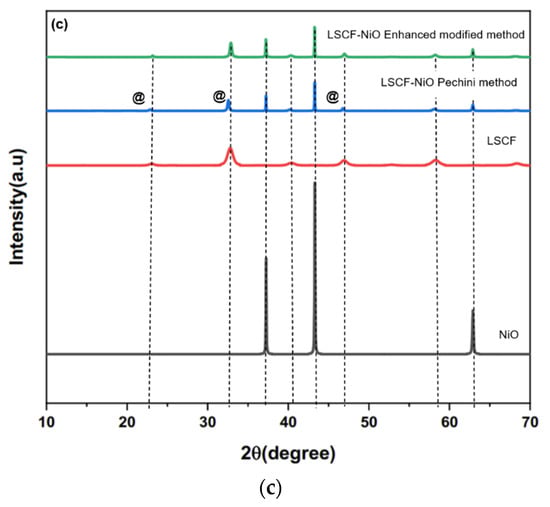 Based on Rietveld refinement analysis described in Figure 1a,b, a comparison peak was taken between LSCF-NiO synthesized with the enhanced modified sol gel method and LSCF-NiO synthesized via the Pechini method from previous research [18]. Previously, Rosli et al. [18] claimed LSCF-NiO was successfully synthesized via the Pechini method at 800 °C. Figure 1c revealed a comparison peak between LSCF-NiO (EM-SG method) and LSCF-NiO (Pechini method) with LSCF (JCPDS = 01-089-1268) and NiO (JCPDS = 01-078-0423). Except for the LSCF and NiO peaks, no tertiary phase is detected using either method. Based on the comparison with the respective Rietveld refinement toward LSCF and nickel oxide, peak position shows no shifting, indicating good compatibility between LSCF and nickel oxide for the EM-SG method under operating conditions. However, the Pechini method shows slight peak shifting at 22.80°, 32.56°, and 46.76°, which can be potentially denoted as insufficient calcination temperature [26].