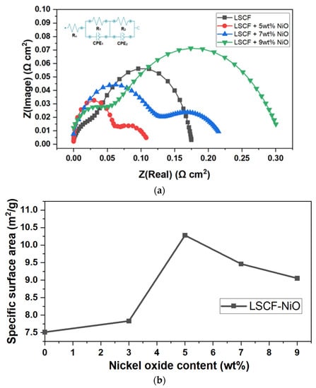 (a) Polarization resistance of bare LSCF and LSCF-NiO with various NiO loading content at operating temperature 800 °C. (b) Specific surface area of various nickel oxide loading towards LSCF powder.